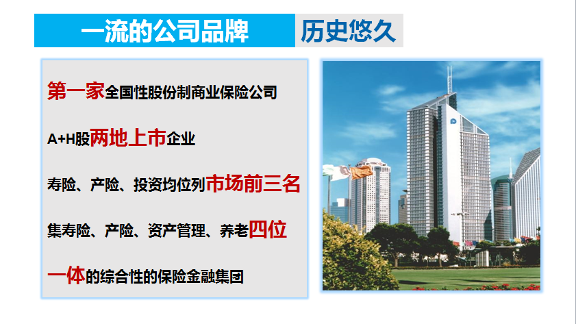 中国太平洋保险(集团)股份有限公司是在1991年5月13日成立的中国太平洋保险公司的基础上组建而成的保险集团公司,总部设在上海,是国内领先的“A+H”股上市综合性保险集团。太平洋保险以打造“在你身边的一流保险金融服务集团”为愿景,坚持“以客户需求为导向,专注保险主业,推动和实现可持续的价值增长”的经营理念,不断完善保险产业链全牌照布局,旗下拥有寿险、产险、资产管理、在线服务、养老保险、健康保险、农业保险等专业子公司,建立了覆盖全国的营销网络和多元化服务平台,提供全方位风险保障解决方案、投资理财和资产管理服务。
